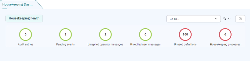 Housekeeping is a critical part of maintaining a healthy RunMyJobs instance. At the very least, is important for Operators and Administrators to frequently look for red dials in the Housekeeping Dashboard screen (Configure > Control > Housekeeping Dashboard), so that you can address housekeeping issues as they arise. It's also important to configure your retention settings to warn you if you start running out of space.