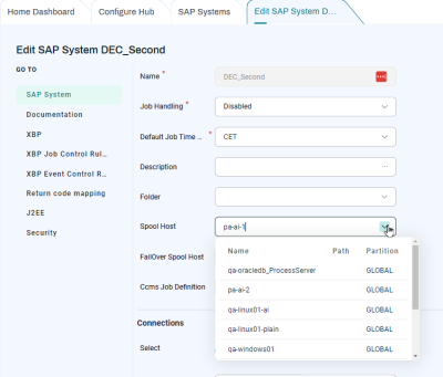 When you add a new SAP System to RunMyJobs, you must define a Spool Host. The Spool Host dropdown list displays all available Platform Agents.