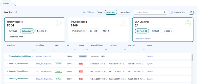 The Monitor screen provides a central location where you can not only monitor the current state of Jobs (Workflow calls and Job calls), but filter them with one click and sort them in a wide variety of ways.
