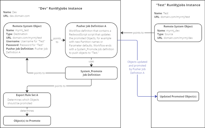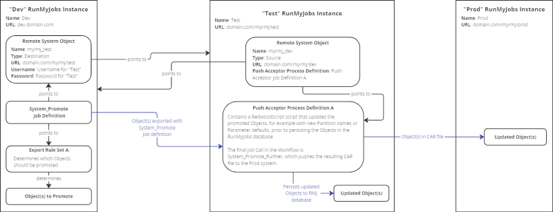 - Promote Further Pusher Job Definition: A Job Definition or Workflow Definition that gets called automatically when a different RunMyJobs instance promotes Objects to your RunMyJobs instance, and which then promotes those Objects "further" to a third RunMyJobs instance. (You can also think of this as "Promote CAR File Job Definition," because it lets you promote a CAR file rather than using an Export Rule Set to define which Objects are promoted.)