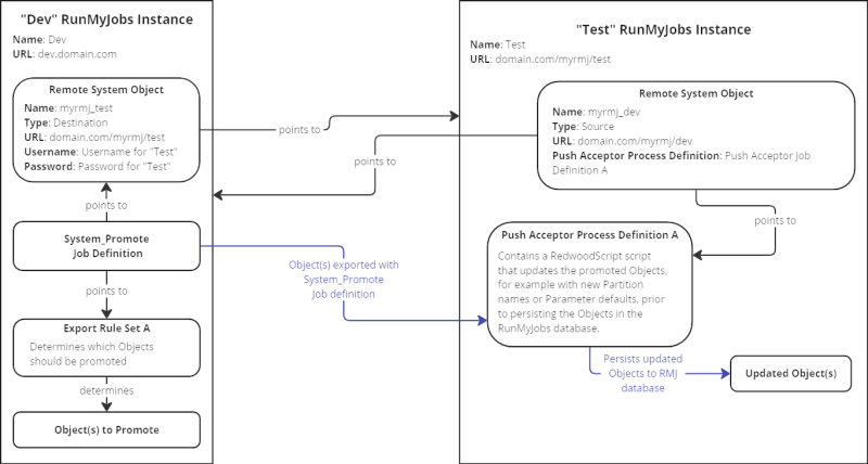 A Push Acceptor Job Definition is an optional Job Definition or Workflow Definition that you create in the destination RunMyJobs instance and specify in that instance with a destination Remote System Object. Here, you can use a RedwoodScript Job Definition to make adjustments to the promoted Objects prior to import. If you use a Workflow Definition, you can add additional Steps, such as sending emails or raising Operator Messages.