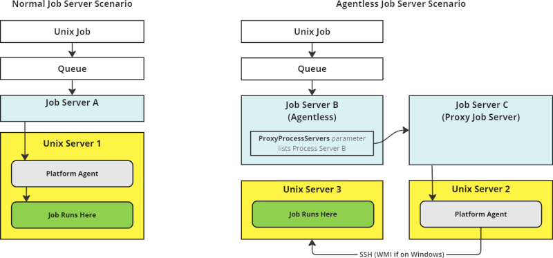 With an agentless Job Server, a Platform Agent installed on one Unix or Windows server runs Jobs on the target server by sending commands to it via SSH (Unix) or WMI (Windows). The following diagram compares a normal scenario with a Unix server with an agentless scenario with a Unix server.