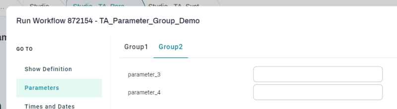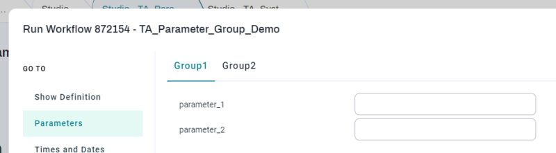 When you are configuring a Parameter, there is a Group Name field. If you enter the same name for a number of the Parameters associated with a Job or Workflow Definition, those Parameters will display together in a tab in the Run Wizard.