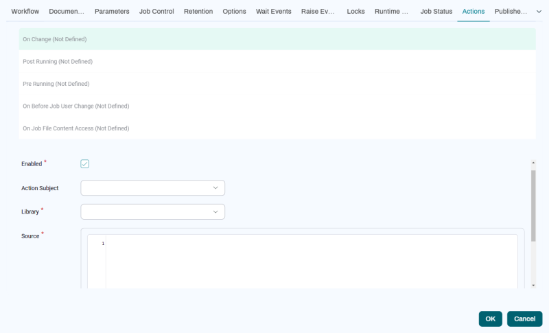 Actions assigned here fire when a Job has completed, and allow you to change the final state of the Job. An Action assigned here is triggered by any transition from Running into a final state (Error, Completed, Killed, Unknown, or Canceled.) |