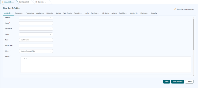 Library | If you are creating a RedwoodScriptJob Definition, you have the option of selecting a user-defined Library. For more information, see Using Libraries. |