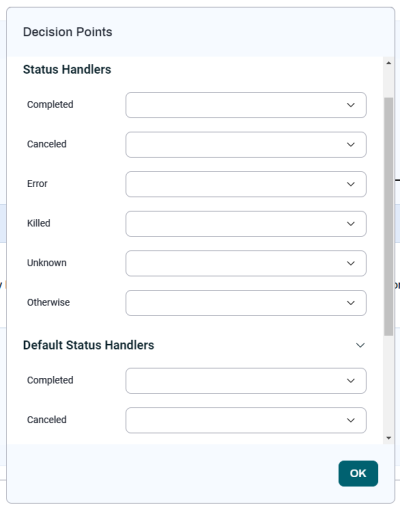 Status Decision Points contain Status Handlers that let you control what happens when a Step or Workflow reaches a particular status. For example, you can use Status Decision Points to retry a Job Call if it fails, or to jump to a different Step.