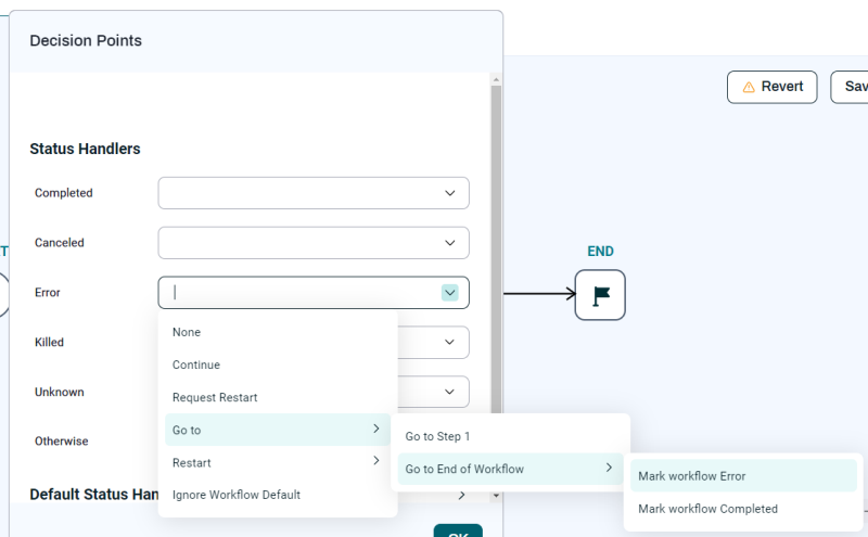 - Mark Workflow Error: Puts the Workflow into Error status.