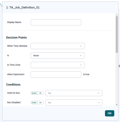 A Job Definition is an Object that defines what a Job is and how it works. It may include Parameter definitions, but it does not include values for those Parameters (other than their Default Expressions, if any). You can tell when you are editing a Job Definition because the configuration overlay is wide and contains multiple tabs down the side.