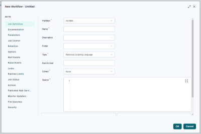 A Workflow Definition is technically a type of Job Definition. It lets you define Workflow-level Parameters, but it does not include values for those Parameters (other than their Default Expressions, if any). You can tell when you are editing a Workflow definition because the configuration overlay is wide and contains multiple tabs down the side. To display the Workflow Definition overlay, click the name of the Workflow in the Workflow Editor.
