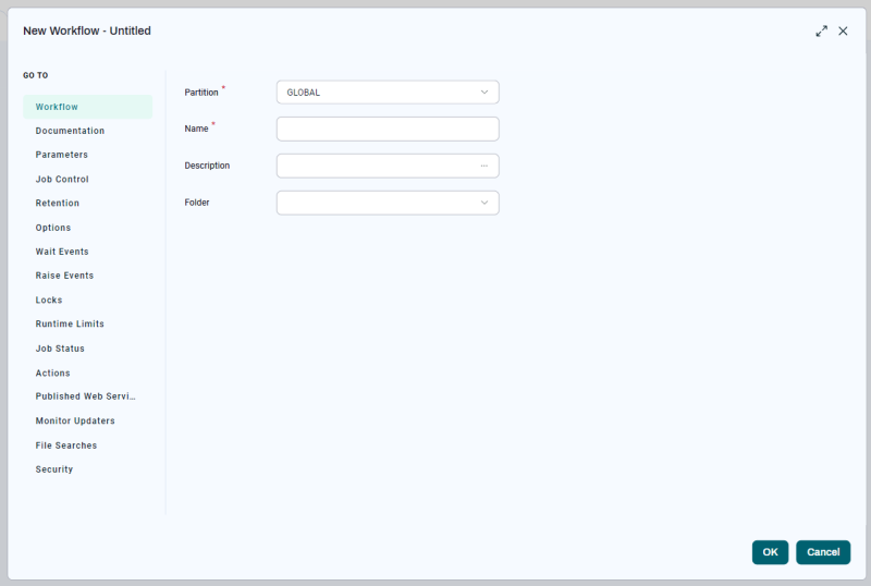 Workflow | Lets you specify a Partition, Name, Description, and Folder for the Workflow. |