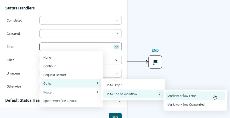 - Mark Workflow Error: Puts the Workflow into Error status.