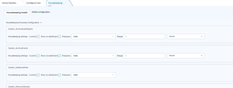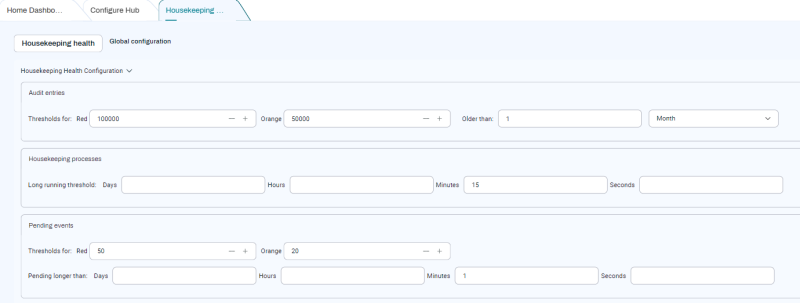 The Global configuration screen lets you control the thresholds for the various graphs that make up the Housekeeping Dashboard. In this screen, the graph configurations are grouped into Housekeeping Health Configuration, Housekeeping Processes Configuration, and Retention Settings.