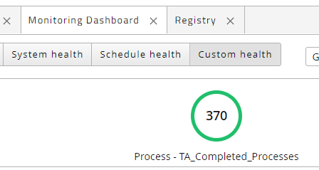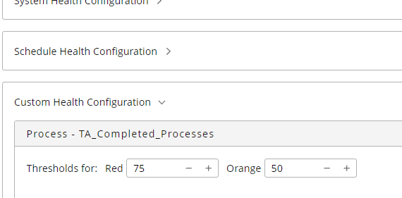 Expand the Custom Health Configuration area and set threshold values for Red and Orange. When the number of processes that matches the filter reaches the Orange value, the monitor will turn orange. If the number of processes that matches the filter reaches the Red value, the custom monitor will turn red.