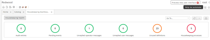The Housekeeping Dashboard provides real-time information on housekeeping health. It lets you monitor audit entries, pending events, unused Job Definitions, unscheduled housekeeping processes, and Operator Messages and user messages that have not been responded to.