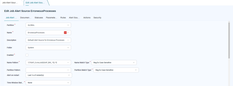 Each Job Alert Source has a Name Pattern, which you can use to match one or more Job Definition or Workflow Definition names. This lets you monitor multiple related Jobs with a single Job Alert Source. You can also configure a single Job Alert Source to generate different Operator Messages for different statuses.