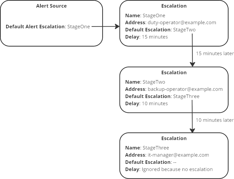 In this example, an Alert Source has a Default Alert Escalation named StageOne