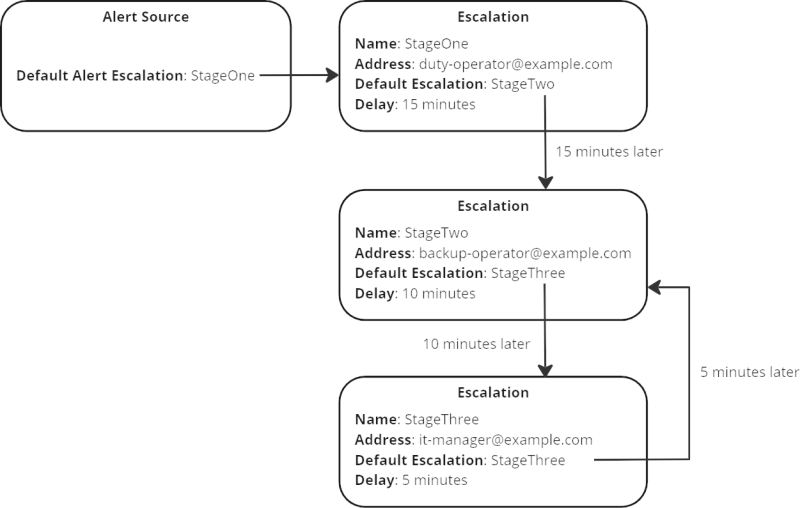 . When an issue occurs (as defined in the Alert Source), an Operator Message is created (as defined in the Alert Source), and an email is immediately sent to duty-operator@example.com