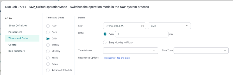 When you run a Job or Workflow with the Run Wizard, you can use the Times and Dates screen to make the Job or Workflow run on a recurring basis.
