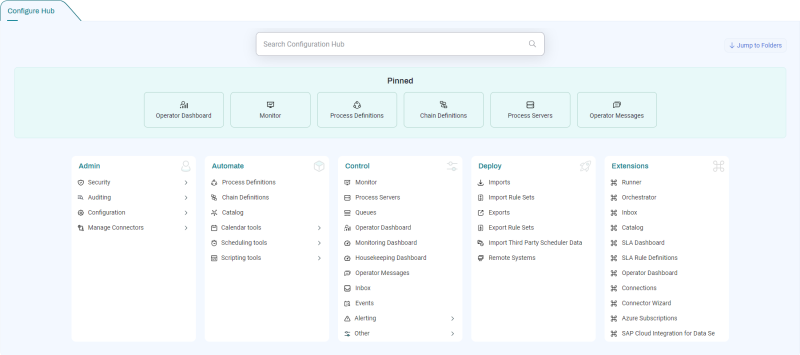 The Configure Hub screen provides a central location where you can access any part of RunMyJobs.