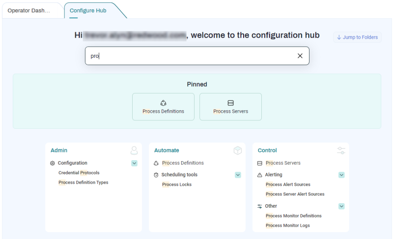 The fastest way to use the Configure Hub screen is to search in the Search Configuration Hub field. Just type the first few characters in the name of the screen you want to display, and the entire screen updates to narrow down your search.