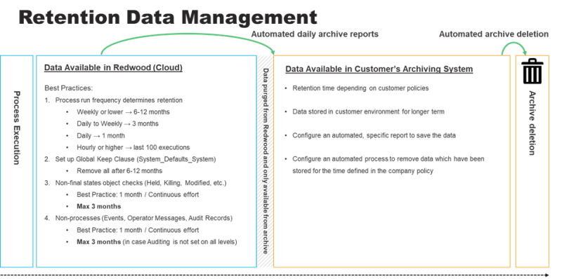 - Data Purge: Redwood's standard housekeeping cleans up the execution data based on the defined retention.