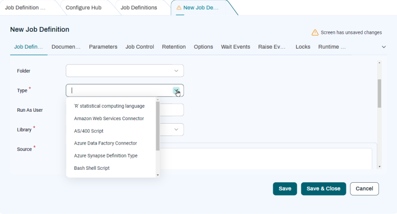 When you create a Job Definition, you can choose an applicable Job Definition Type from the Script Type dropdown list.