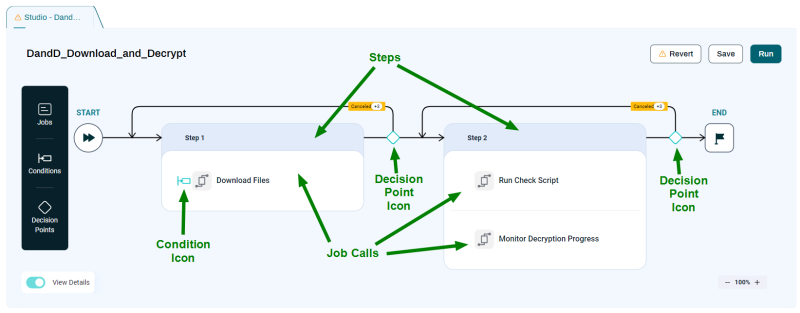 If Decision Points let you execute a Step or Job only if certain conditions are met. For example, you can run an alerting Job only if a report file is empty.
