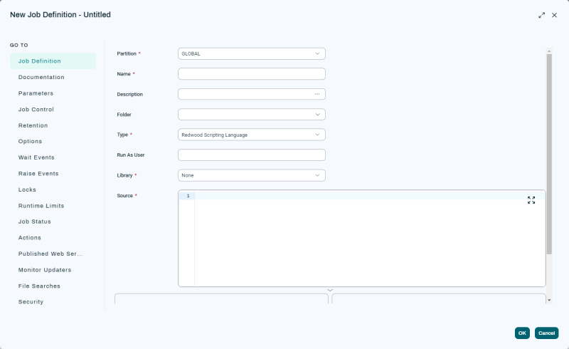 A Job Definition is an Object that defines what a Job is and how it works. It may include Parameter definitions, but it does not include values for those Parameters (other than their Default Expressions, if any). You can tell when you are editing a Job Definition because the configuration overlay is wide and contains multiple tabs down the side.