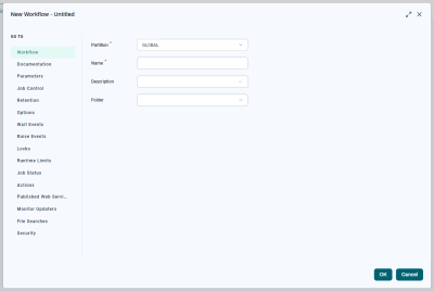 A Workflow Definition is technically a type of Job Definition. It lets you define Workflow-level Parameters, but it does not include values for those Parameters (other than their Default Expressions, if any). You can tell when you are editing a Workflow definition because the configuration overlay is wide and contains multiple tabs down the side. To display the Workflow Definition overlay, click the name of the Workflow in the Workflow Editor.