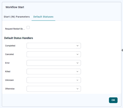 To display the Workflow Call overlay, click the START circle for the Workflow. The overlay has two tabs. The Default Statuses tab is displayed here.