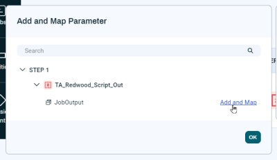 The next step is to specify Job Definition Parameter that you want to map from. Either use the Search field at the top to find this Parameter, or expand the tree until you locate it. In this case, we're looking for the JobOutput Parameter. Hover over the target Parameter to display the Add and Map button, then click it.