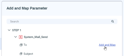 The next step is to specify Job Definition Parameter that you want to map to. Either use the Search field at the top to find this Parameter, or expand the tree until you locate it. In this case, we're looking for the To Parameter. Hover over the target Parameter to display the Add and Map button, then click it.